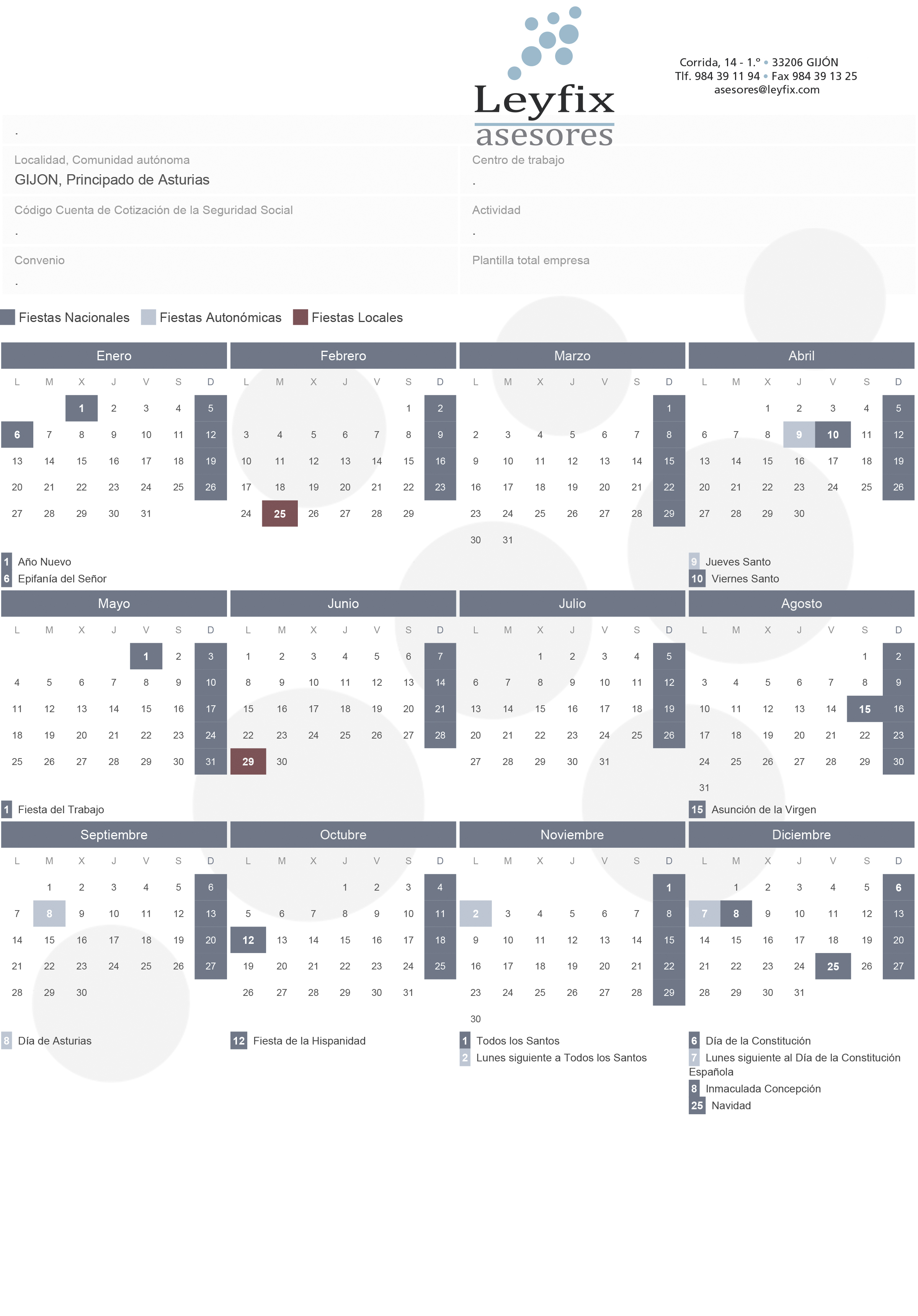 El calendario laboral ha de contener la información referente a los horarios de trabajo del centro así como los días inhábiles, tanto a nivel nacional como a nivel autonómico y local.
